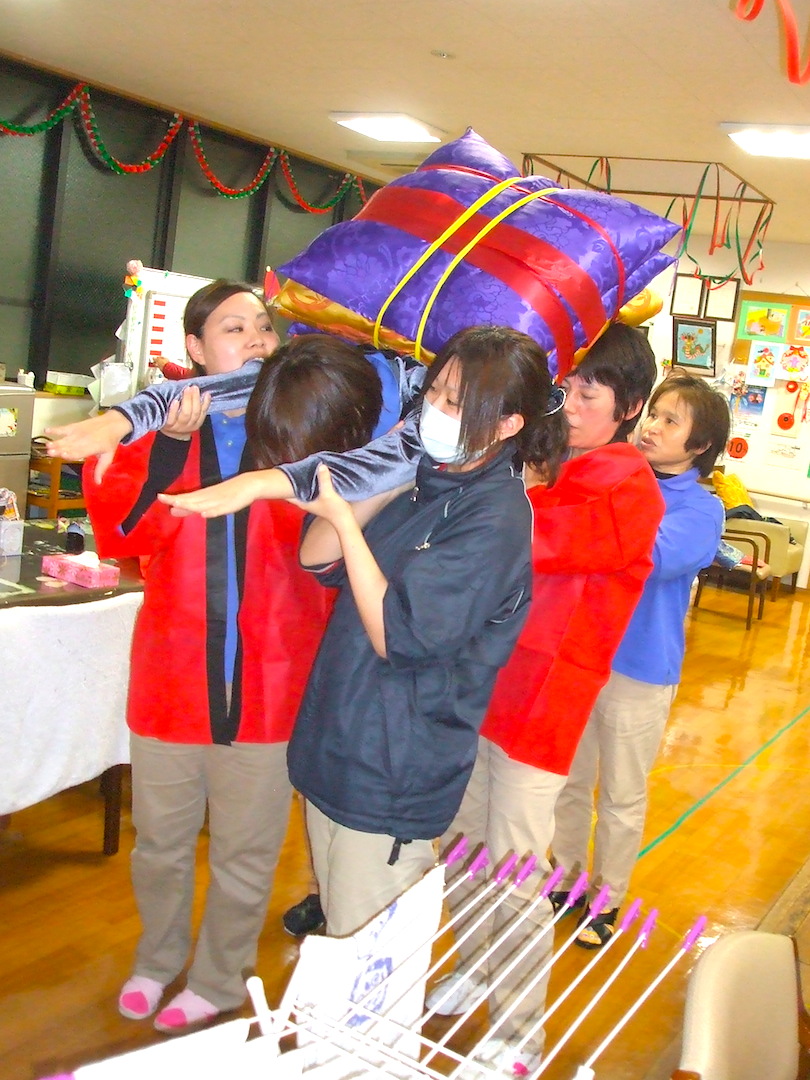 長崎と言えばおくんち、おくんち言えばコッコデショです。そのコッコデショを人間でやるという荒技に打って出た道ノ尾の職員。どうなる事かと思っていましたが、さすがポテンシャルが高い職員の皆様で、見事に”人間コッコデショ”という荒技をやってのけました(笑)。利用者様からも喝采が飛び交うなどして、大盛況でした。