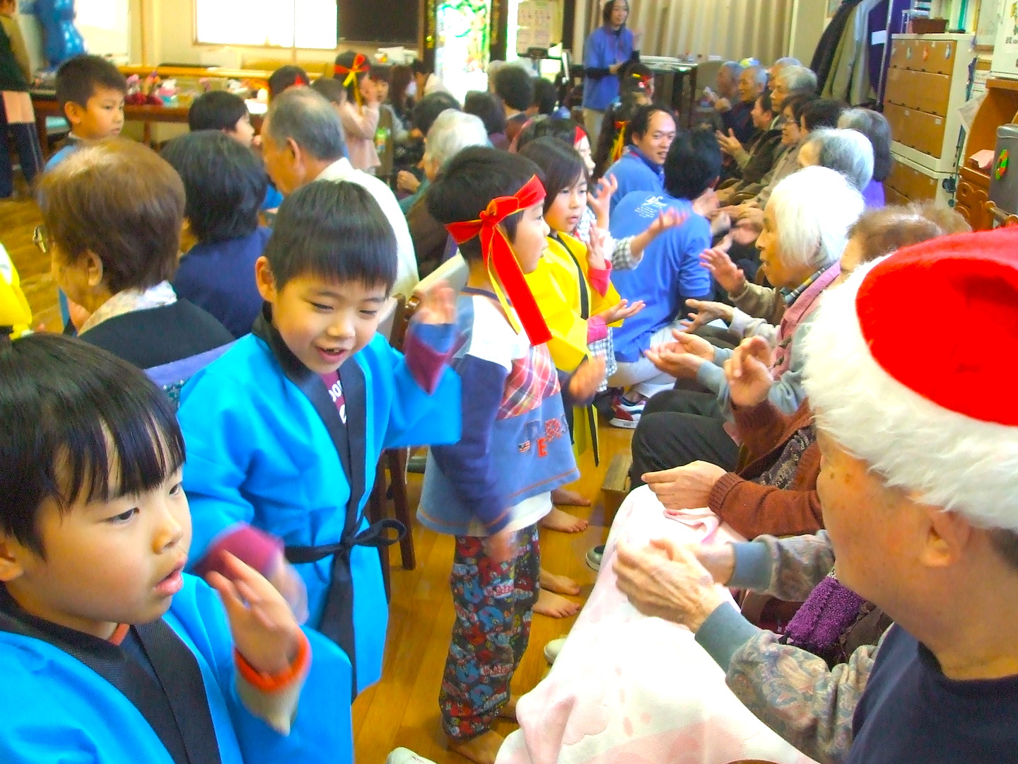 道ノ尾保育園の園児さんたちも、”歌や踊り”を披露して頂きました。利用者様にとっては孫のような園児さんたちの催し物を、利用者様は微笑ましく見ておられました。しかし、子供が本当に元気いっぱいで、見ている側もたくさん元気をもらいますね。