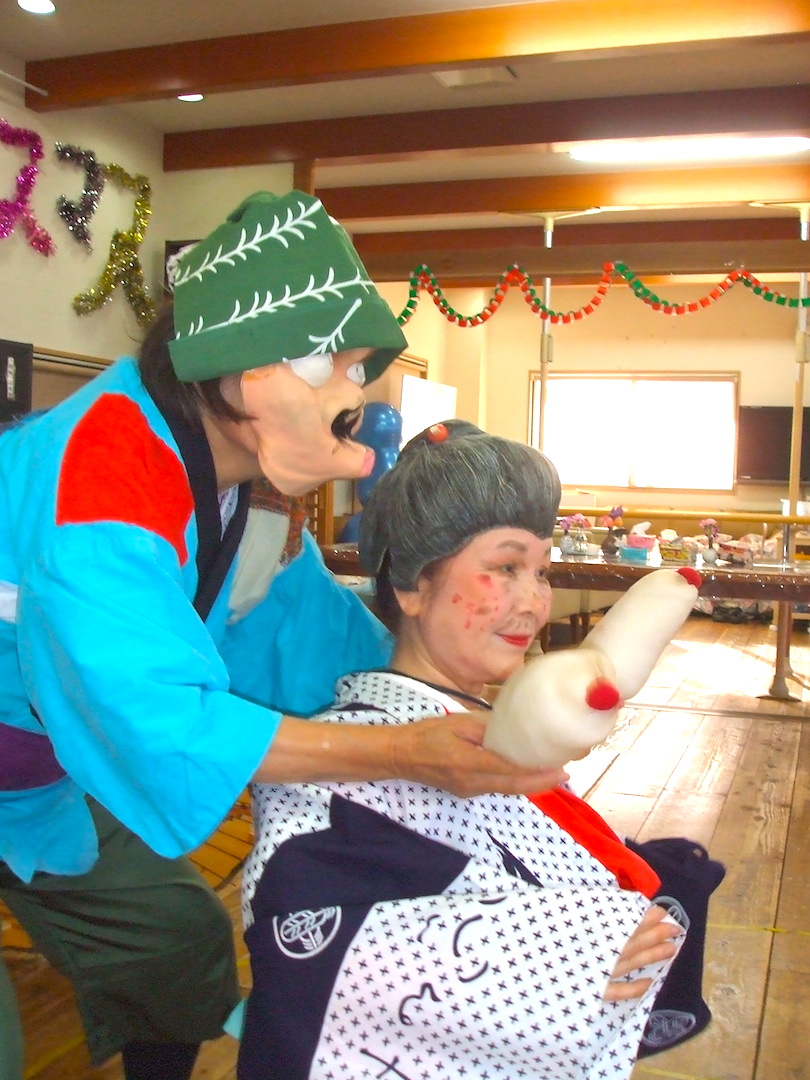 その他に、職員の”二人羽織”もあり、副島社長(左)と道ノ尾の本田さん(右)とバナナを食べさせられていました。バナナの皮を剥かずにそのまま食べさせられていたりする光景を見ながら、利用者様も大爆笑。
