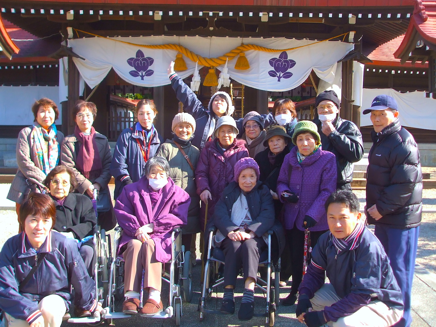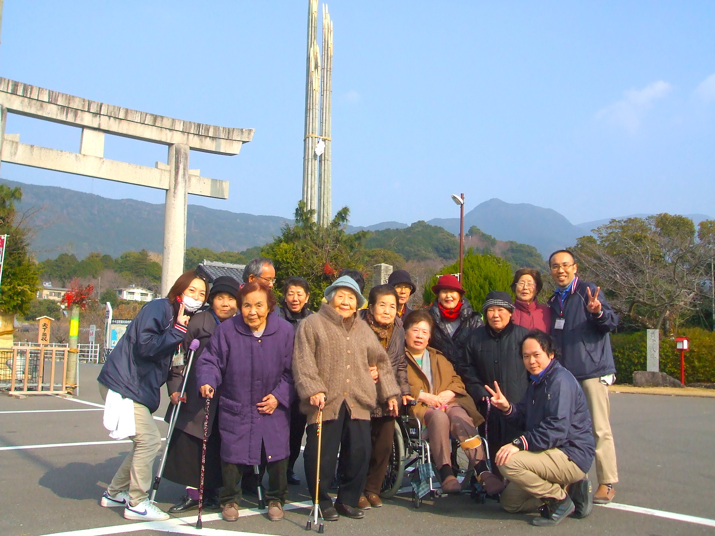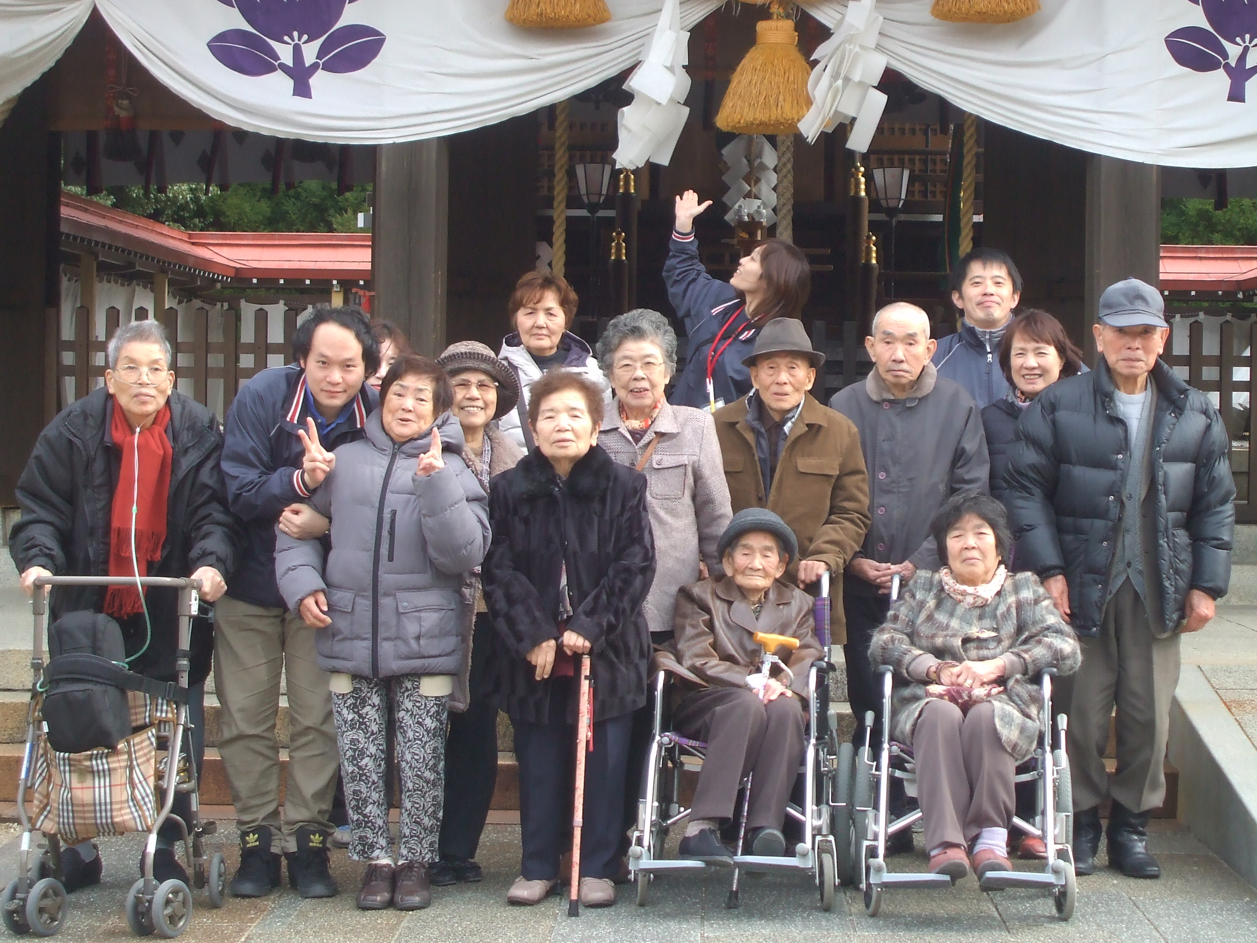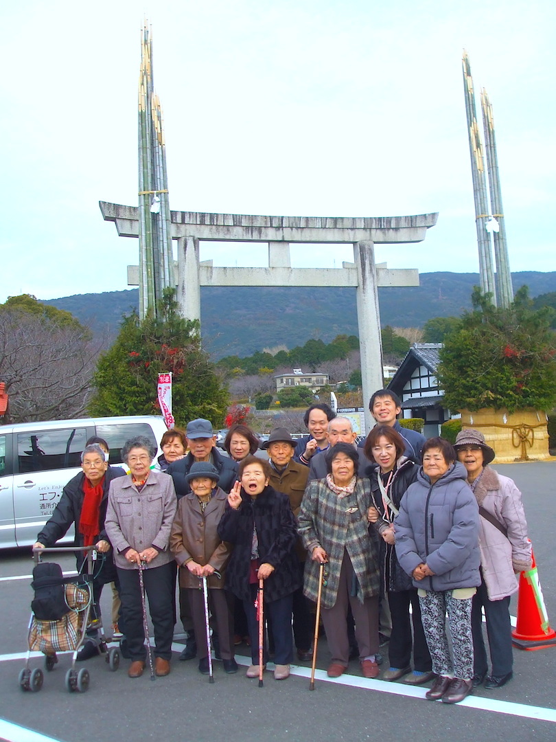 平成26年 エフステージ道の尾 初詣 (橘神社) 2014-01-20 2014-02-25 WRITER 石原 一平 この記事を書いている人 - WRITER - 石原 一平 企画広報を中心に、当社メディアサイトの運営やデザイン、記事の担当をしています。ロスジェネ世代の1981年生まれ。バイタル勤続15年目(2019年現在)を迎えています。自社の様々な活動や介護福祉のより良い情報を発信するために、日々奮闘中。僭越な文章ではありますが、暖かい心でお読み下さい。 平成26年1月14日から17日(日曜以外)の期間に、エフステージ道の尾で千々石の橘神社へ初詣の参拝に行って参りました。 昼食の「庄屋」ではみんな御馳走に舌つづみを打たれ、夢中で食べられていました。 お互いの食事に「そっちの方が美味しそうね~。」などの声も聞かれていました。 橘神社では世界一の門松に触れたり、ご利益を受けるように抱きつかれたり楽しかったですね。最後は門松の前で記念写真を撮りました。 ついでに、皆さんの世界一の笑顔が見れて良かったです。 スタッフは、来年も利用者の皆様と参拝できますようお願いしました。 この記事を書いている人 - WRITER - 石原 一平 企画広報を中心に、当社メディアサイトの運営やデザイン、記事の担当をしています。ロスジェネ世代の1981年生まれ。バイタル勤続15年目(2019年現在)を迎えています。自社の様々な活動や介護福祉のより良い情報を発信するために、日々奮闘中。僭越な文章ではありますが、暖かい心でお読み下さい。 前の記事 -Prev- 平成25年 エフステージ中央 クリスマス会 次の記事 -Next- 平成25年度グループ新年会を開催しました。 関連記事 - Related Posts - 新入社員と共に荒地を最高の畑に! 「看取りケア」在宅で最期を迎える人は、たった1割。 平成26年度 エフステージ桜馬場 運営懇談会 平成26年度 バイタル福祉用具 合同研修in福岡 最新記事 - New Posts - デイのおやつレク!新人栄養士の本格おやつ作り「さつまいものデザート」! エフ・ステージ白木の地域活動のご報告! エフ・ステージ白木の家庭菜園活動! 新卒新入社員と畑作業で交流!前年に続き恒例行事です。
